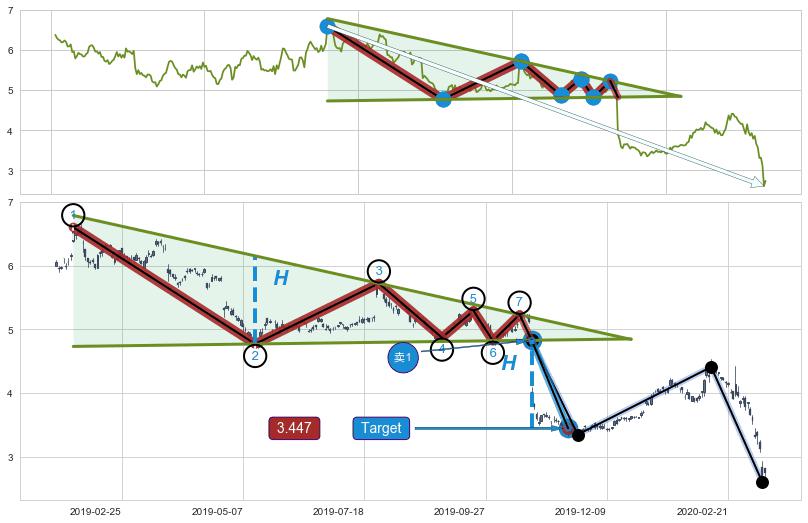 ➣ 【多空双方观望→争持→促使价格波动日益狭窄→空方打破攻守平衡点】对称三角形中继整理, 已在2019-10-24突破【支撑】颈线 4.83 →演变成下降通道