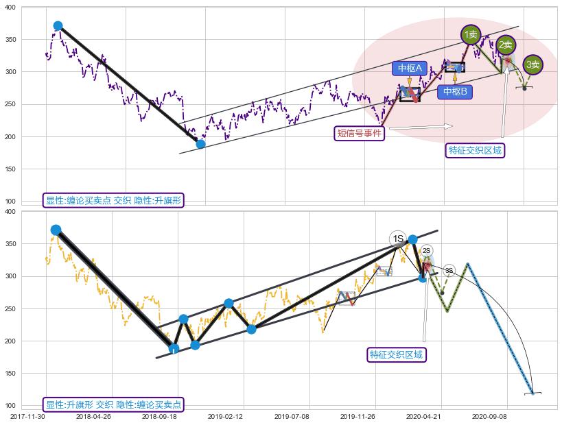➣ 缠论买卖点:上升缠:猜想2卖趋势延续,蓄力下跌至3卖(大周期趋势均值回复中的小周期趋势跟踪)