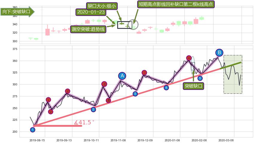 ➣ 2019-08-05-2020-02-21上升趋势存在反转[风险],其原上升趋势的支撑位(346.22)已破位[强阻力信号],原上升趋势角度: 41.5˚