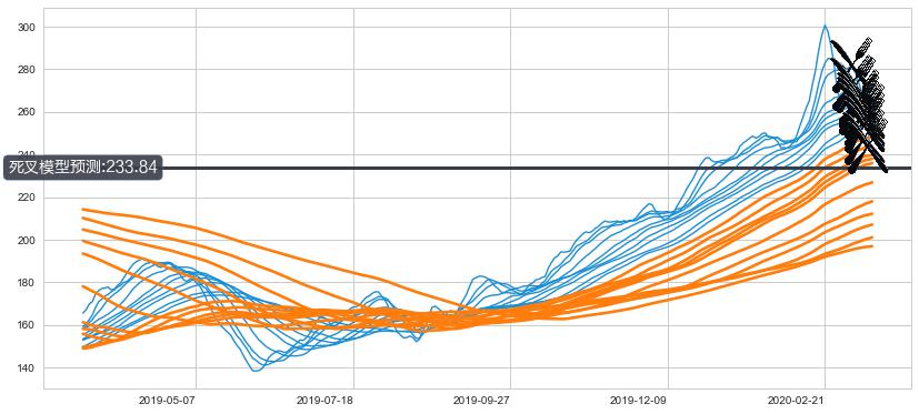 ➣ 70小时均线于(2020-03-10: 247.34)形成【死叉】基于【死叉历史模型】预测死叉后最低波谷价格: 217.30, 死叉后最低价格216.31,虽然已经到达预测最低波谷价格,但耗时间很短动能很强, 预期继续下跌
