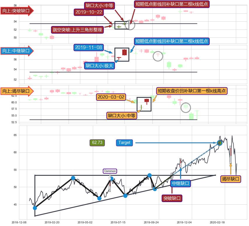 ➣ 普通缺口在【上升三角形整理】震荡整理形态中出现