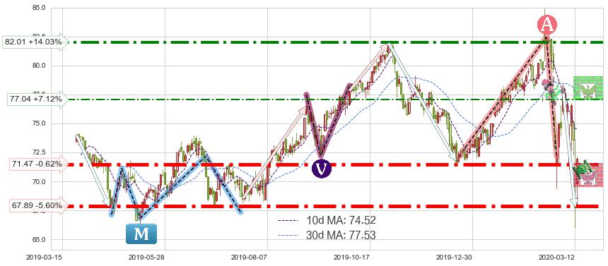 ♘ 阻力价格位77.04,可信任强度43.84%,距离最后交易2020-03-13形成的收盘价格71.92相差 +7.12%