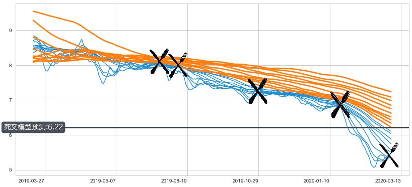 ➣ 10小时均线于(2020-01-22: 6.89)形成【死叉】基于【死叉历史模型】预测死叉后最低波谷价格: 6.36, 死叉后最低价格4.77,已经下跌超出预测最低波谷价格, 预期反弹