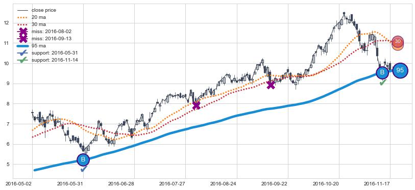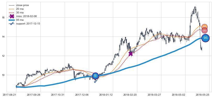➢ 最优均线组合共正确确认支撑阻力信号9处,正确确认率 69.23%