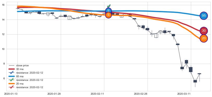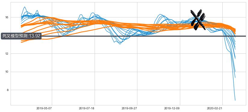 ➣ 34小时均线于(2020-01-10: 15.55)形成【死叉】基于【死叉历史模型】预测死叉后最低波谷价格: 14.23, 死叉后最低价格5.45,已经下跌超出预测最低波谷价格, 预期反弹