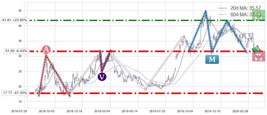 ♘ 支撑价格位31.59,可信任强度89.94%,距离最后交易2020-03-13形成的收盘价格33.76相差 -6.43%
