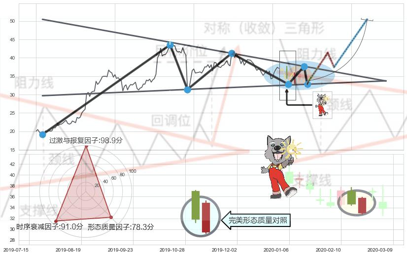 ➣ AI智能: 预测【多空区域上下窄幅震动→价格波动日益狭窄→多方占优】对称三角形中继整理向上突破,预测将在2020-03-23突破颈线, 演变成上升通道