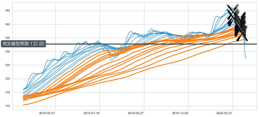 ➣ 90小时均线于(2020-03-04: 138.26)形成【死叉】基于【死叉历史模型】预测死叉后最低波谷价格: 130.92, 死叉后最低价格115.34,已经下跌超出预测最低波谷价格, 预期反弹