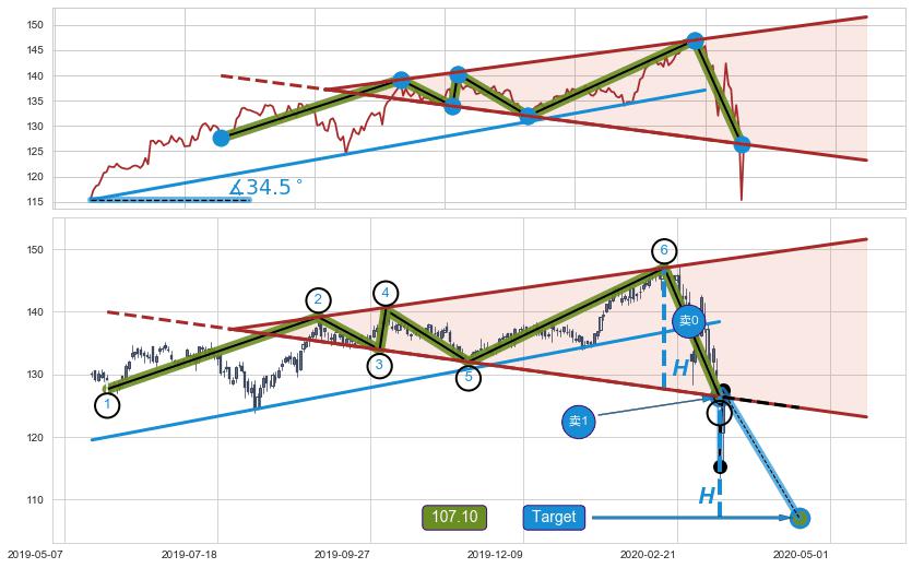 ➢ 最小反转跌幅→𝐇: 19.34 (逐步抬高阻力斜边最后的阻力点⑥与支撑边垂直距离)