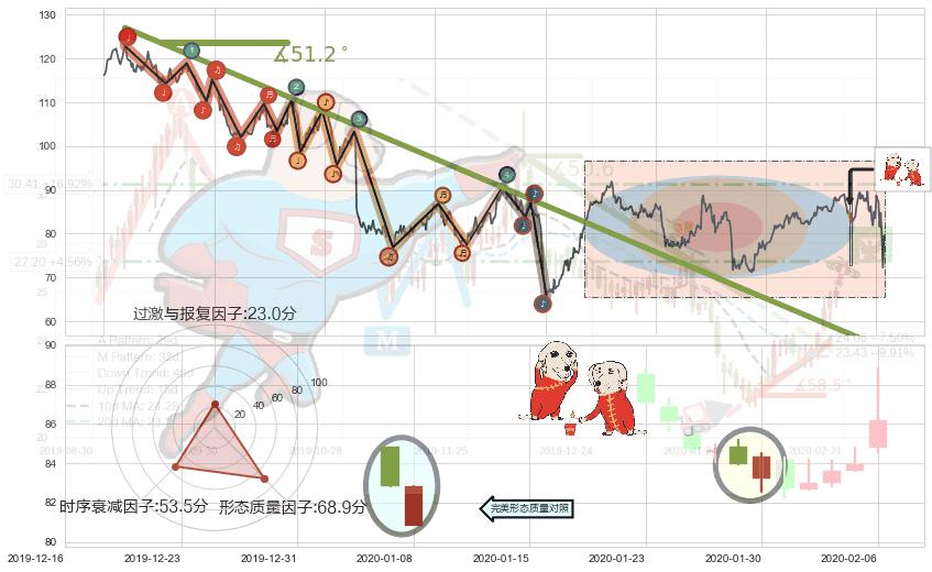 从2017-06-19至2018-01-23,共包含151个交易日,阶段股价下跌-10.84%,阶段股价变动位移路程比: 1 : 9,下跌趋势角度: 45.7