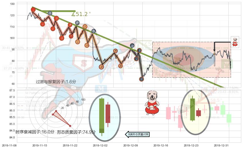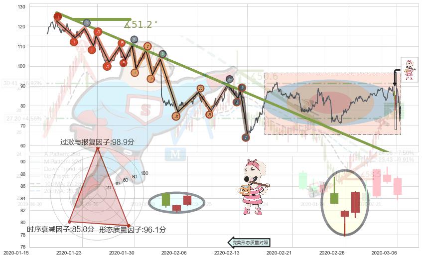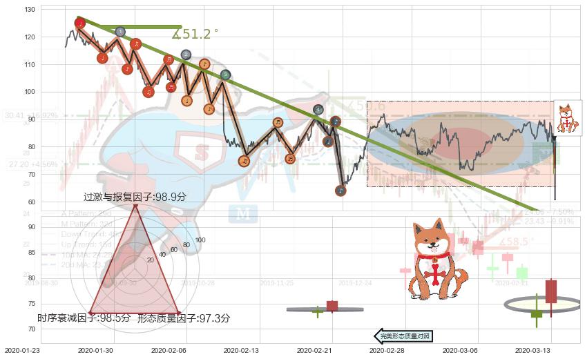 从2017-06-19至2019-03-20,共包含441个交易日,阶段股价下跌-24.99%,阶段股价变动位移路程比: 1 : 18,下跌趋势角度: 51.2