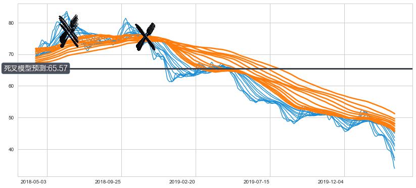 ➢ 55小时均线于(2018-06-14: 75.85)形成【死叉】基于【死叉历史模型】预测死叉后最低波谷价格: 67.52, 死叉后最低价格31.22,已经下跌超出预测最低波谷价格, 预期反弹