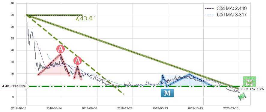 从2017-10-19至2020-03-13,共包含603个交易日,阶段股价下跌-204.42%,阶段股价变动位移路程比: 1 : 10,下跌趋势角度: 43.6
