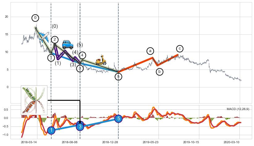 ➣ 第一, 三, 五浪下跌动能逐渐【衰弱变小】,趋势呈现不稳迹象