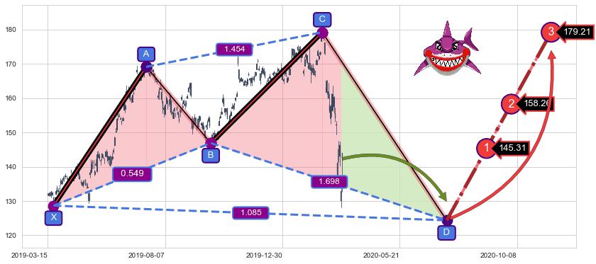 ➢ 距离预测D点位置尚有下跌空间,短线依然【看跌】, 耐心等待看涨【鲨鱼】形态反转启动