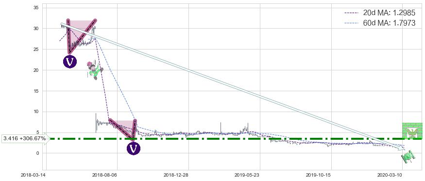从2018-04-13至2020-03-13,共包含483个交易日,阶段股价下跌-231.41%,阶段股价变动位移路程比: 1 : 6,2018-06-22向↘︎形成缺口,跳空下跌-76.66%˚