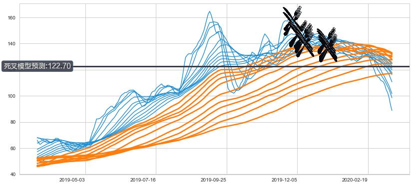 ➣ 90小时均线于(2020-01-07: 137.33)形成【死叉】基于【死叉历史模型】预测死叉后最低波谷价格: 118.71, 死叉后最低价格78.81,已经下跌超出预测最低波谷价格, 预期反弹