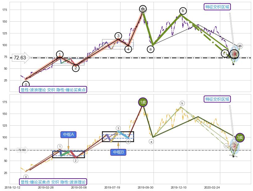 ➢ 【中枢A】:2019-03-12-2019-04-12,中枢由4笔构成,共24交易日, ZG=70.64, ZD=60.74