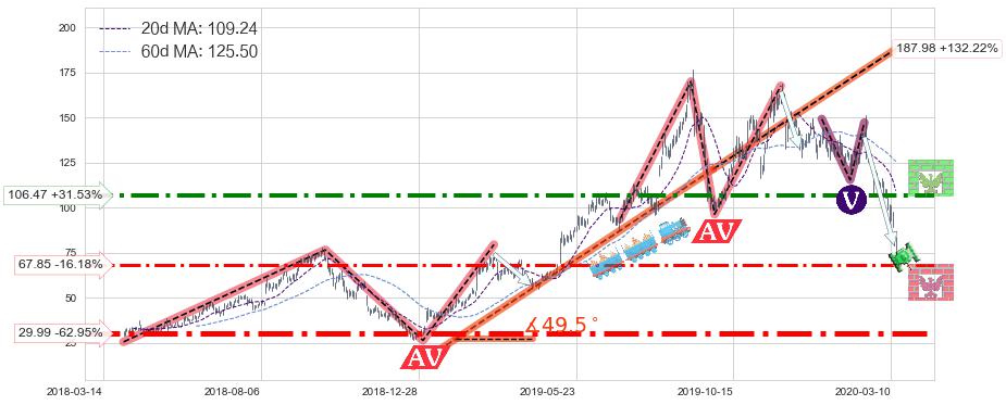 ♘ 支撑价格位67.85,可信任强度63.36%,距离最后交易2020-03-13形成的收盘价格80.95相差 -16.18%