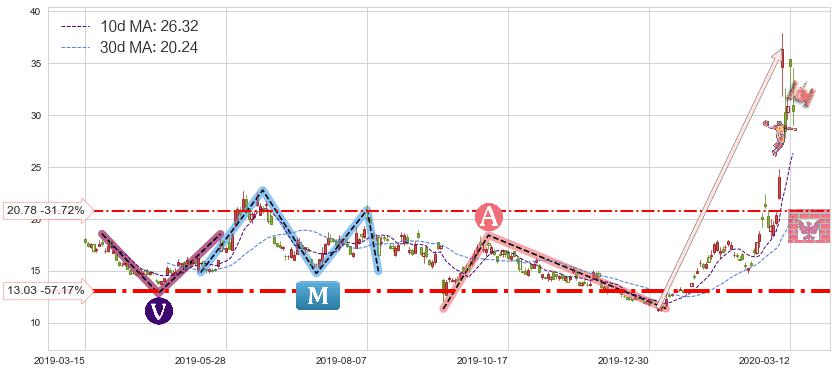 ♘ 支撑价格位20.78,可信任强度46.51%,距离最后交易2020-03-13形成的收盘价格30.43相差 -31.72%