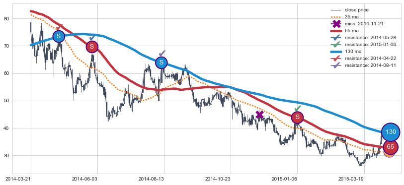 2014-03-21至2015-04-09 慢线与快线呈空头排列, 慢线与快线接触少,无缠绕