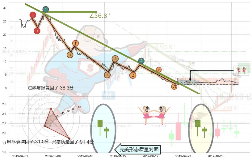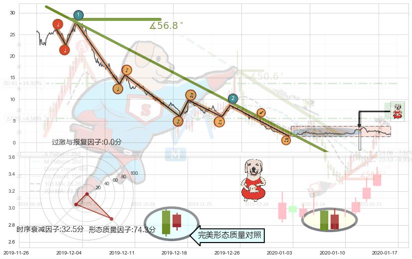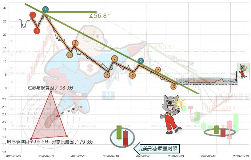 从2018-05-15至2020-03-13,共包含461个交易日,阶段股价下跌-217.44%,阶段股价变动位移路程比: 1 : 7,下跌趋势角度: 54.4