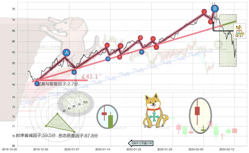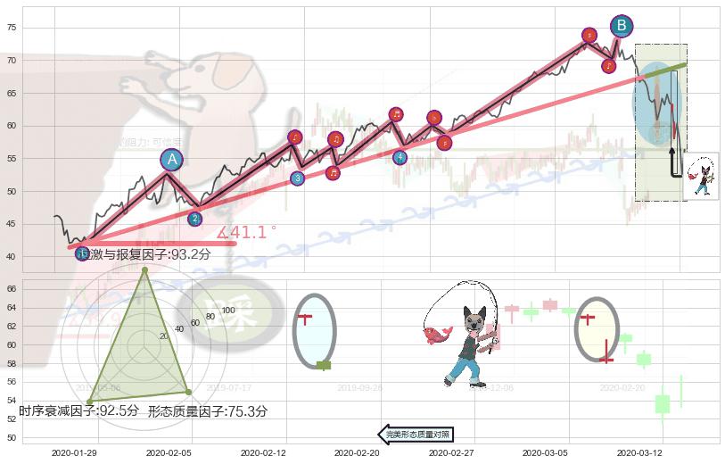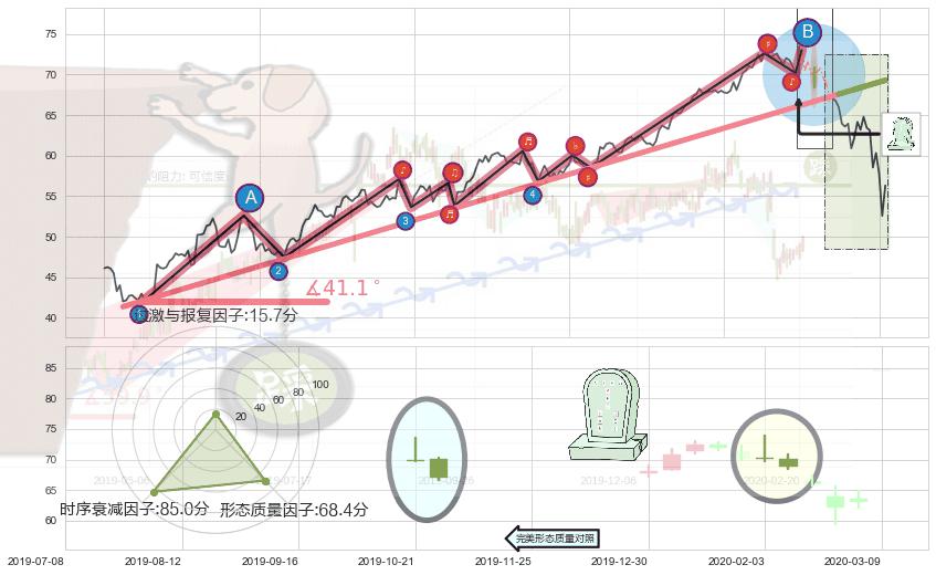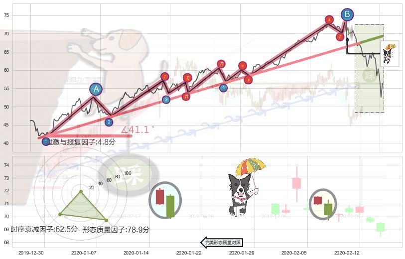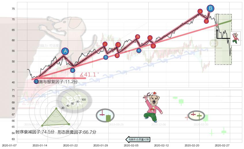 从2019-03-22至2020-02-21,共包含232个交易日,阶段股价上涨47.95%,阶段股价变动位移路程比: 1 : 5,上涨趋势角度: 41.1
