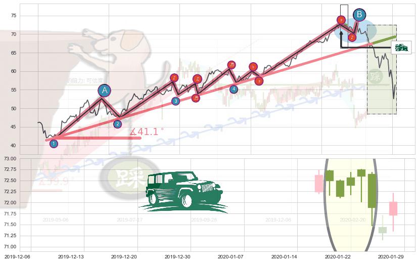 ✂️ 2019-03-22-2020-02-21上升趋势存在反转[风险],其原上升趋势的支撑位(69.29)已破位[强阻力信号],原上升趋势角度: 41.1˚