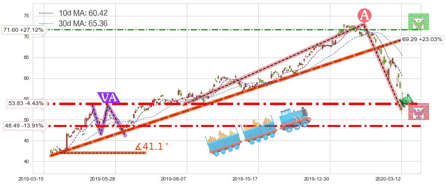♘ 阻力价格位71.60,可信任强度54.22%,距离最后交易2020-03-13形成的收盘价格56.32相差 +27.12%