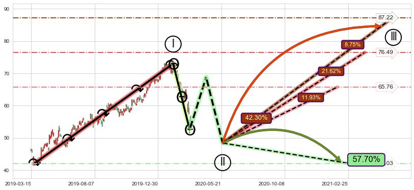➣ 高概率大级别循环上涨浪被破坏,反转向下(突破5浪起点)概率57.70%