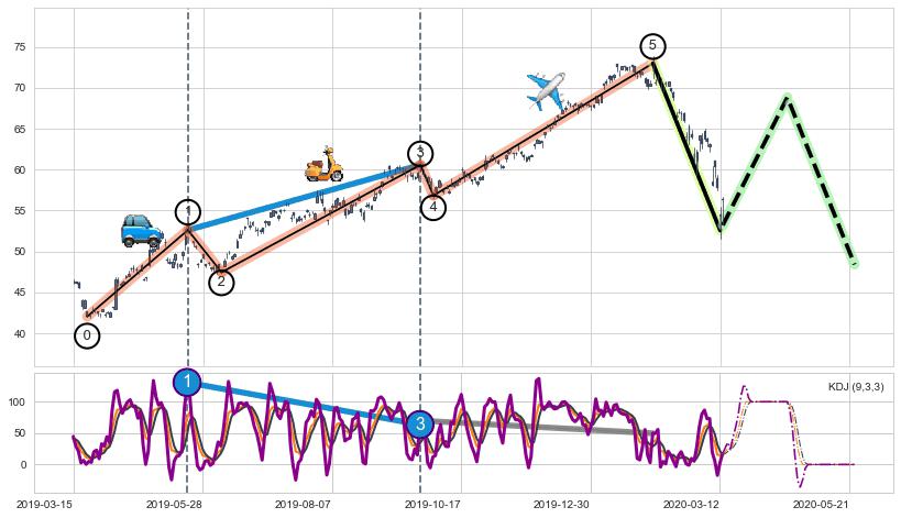 ➣ 第一, 三驱动浪端点:【KDJ】走势出现【常规背离 & 反转信号】背离程度99.00%,背离夹角角度77.3˚,背离程度较大