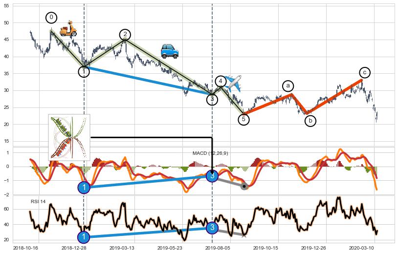 ➣ 波浪理论:猜想达到c点后小反弹终止反转下跌 → 下跌 → 【拐点】临近 → 阶段均值回复结束后继续大周期趋势跟踪