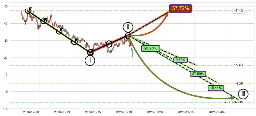 ➣ 缠论中枢点:猜想破位中枢B后持续下拉 → 下跌 → 破位中枢B支撑 → 持续趋势跟踪