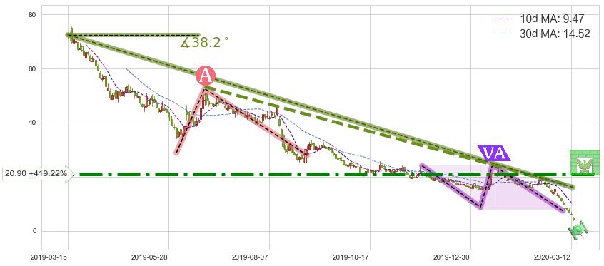 从2019-06-21至2020-03-13,共包含184个交易日,阶段股价下跌-218.73%,阶段股价变动位移路程比: 1 : 3,下跌趋势角度: 38.0