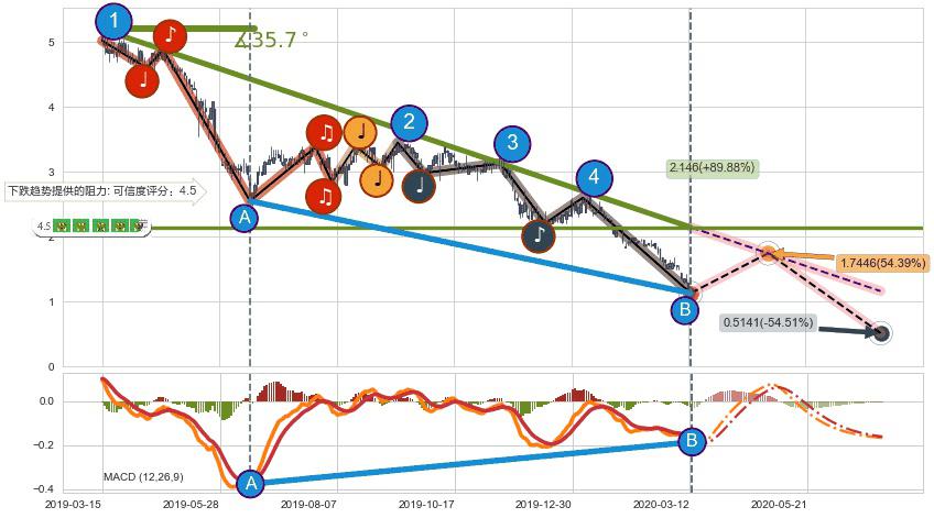 ♘ 在最后的下跌阶段2019-03-15至2020-03-13,存在 持续未破位的阻力位 ,阻力价格2.146,可信任强度88.80%,其距离最后价格1.1300相差 +89.88%