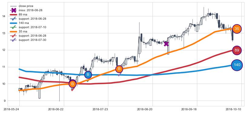 ➢ 最优均线组合共正确确认支撑阻力信号7处,正确确认率 41.18%