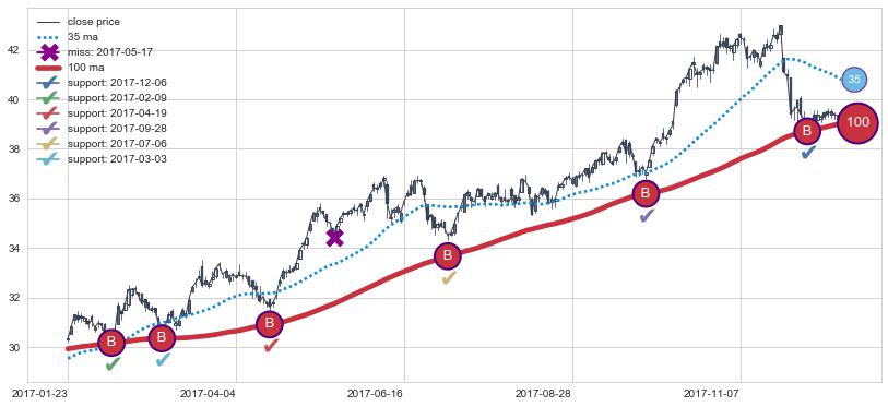 ➢ 最优均线组合共正确确认支撑阻力信号14处,正确确认率 70.00%