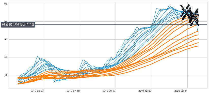 ➣ 40小时均线于(2020-02-14: 57.97)形成【死叉】基于【死叉历史模型】预测死叉后最低波谷价格: 55.82, 死叉后最低价格48.69,已经下跌超出预测最低波谷价格, 预期反弹