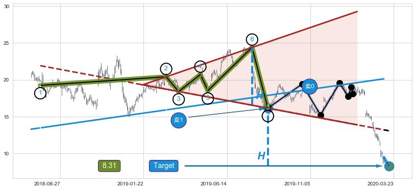 ➢ 最小反转跌幅→𝐇: 7.84 (逐步抬高阻力斜边最后的阻力点⑥与支撑边垂直距离)