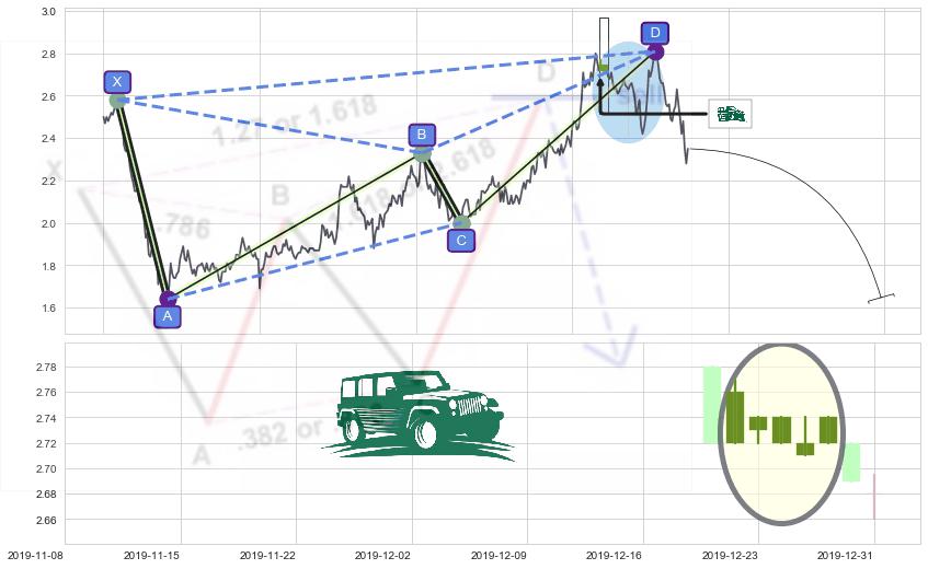 ➣ 谐波蝴蝶:已到达d点:猜想c拉升到达d点后泄力性下沉下跌(均值回复)