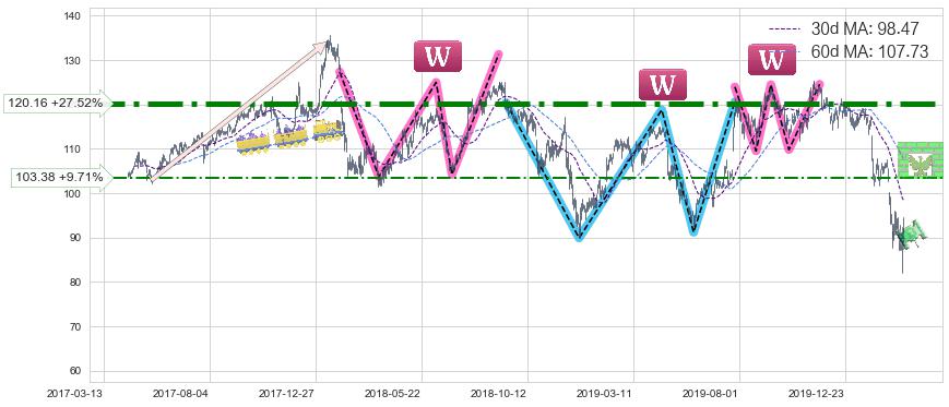 ♘ 阻力价格位103.38,可信任强度54.64%,距离最后交易2020-03-13形成的收盘价格94.23相差 +9.71%