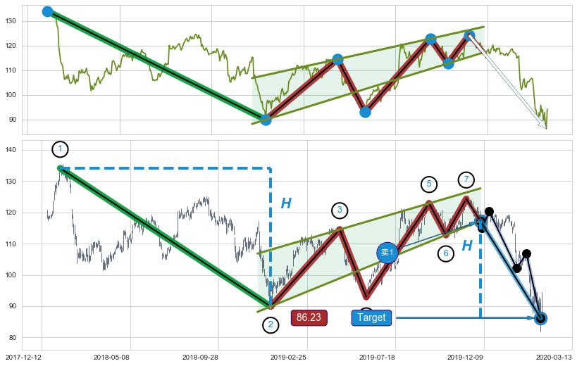➣ 升旗形:下跌target达成后 → 猜想下跌动能竭尽反转上涨 → 机会信号 → 大趋势均值回复