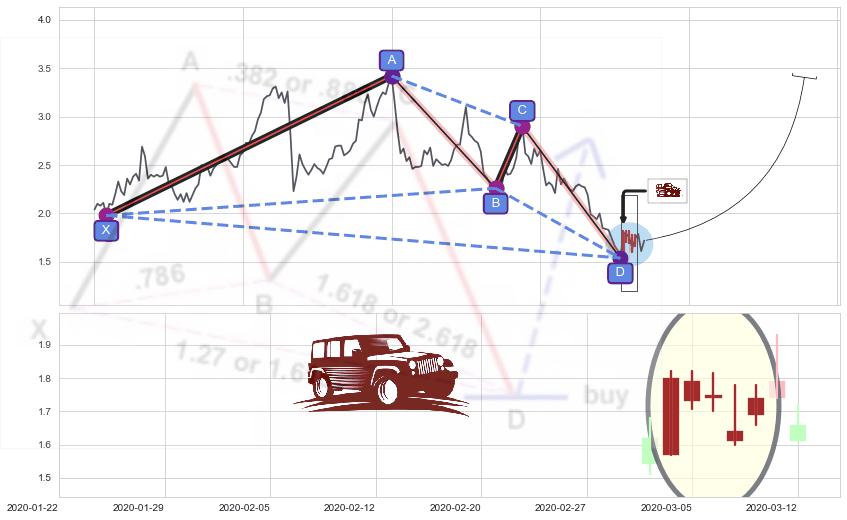 ➢ 谐波蝴蝶:c下跌到达d:猜想拉升 → 上涨 →【拐点】强支撑临近 → 大趋势均值回复