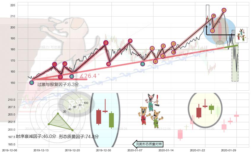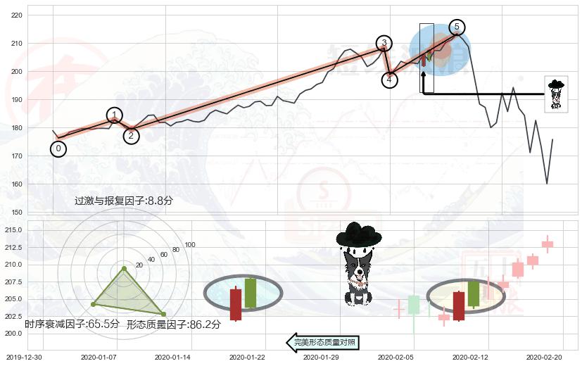 ➢ 🕰 价格走势在2020-01-27至2020-01-28期间形成顶部尽头线(下山虎),残存影响值:-2.40