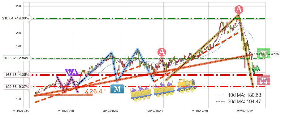 ♘ 支撑价格位168.18,可信任强度94.84%,距离最后交易2020-03-13形成的收盘价格175.83相差 -4.35%