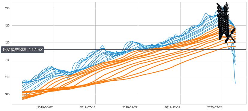 ➣ 105小时均线于(2020-02-24: 123.21)形成【死叉】基于【死叉历史模型】预测死叉后最低波谷价格: 114.12, 死叉后最低价格99.38,已经下跌超出预测最低波谷价格, 预期反弹