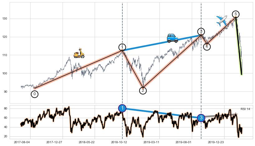 ➣ 第一, 三驱动浪端点:【RSI】走势出现【常规背离 & 反转信号】背离程度99.00%,背离夹角角度40.4˚,背离程度较大