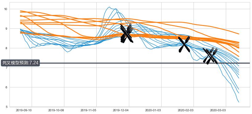 ➣ 10小时均线于(2020-02-19: 7.59)形成【死叉】基于【死叉历史模型】预测死叉后最低波谷价格: 6.96, 死叉后最低价格4.80,已经下跌超出预测最低波谷价格, 预期反弹