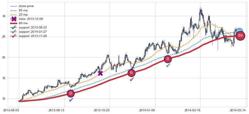➢ 最优均线组合共正确确认支撑阻力信号9处,正确确认率 64.29%