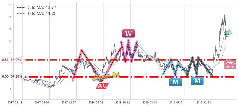 ♘ 支撑价格位8.83,可信任强度83.53%,距离最后交易2020-03-13形成的收盘价格14.03相差 -37.07%